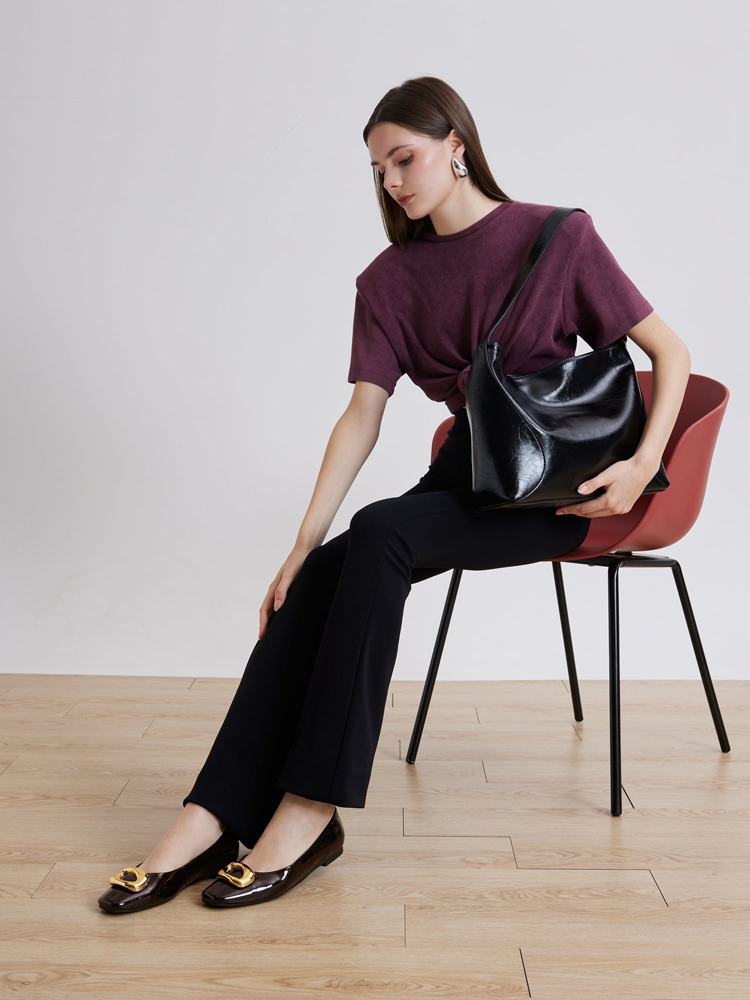 A bold gold-tone buckle atop the sculptural square toe lends classic modernity, while the thick, padded, and breathable insole with arch support delivers seamless comfort. Completed with a soft, flexible rubber outsole, these flats exemplify effortless grace for the discerning woman.
