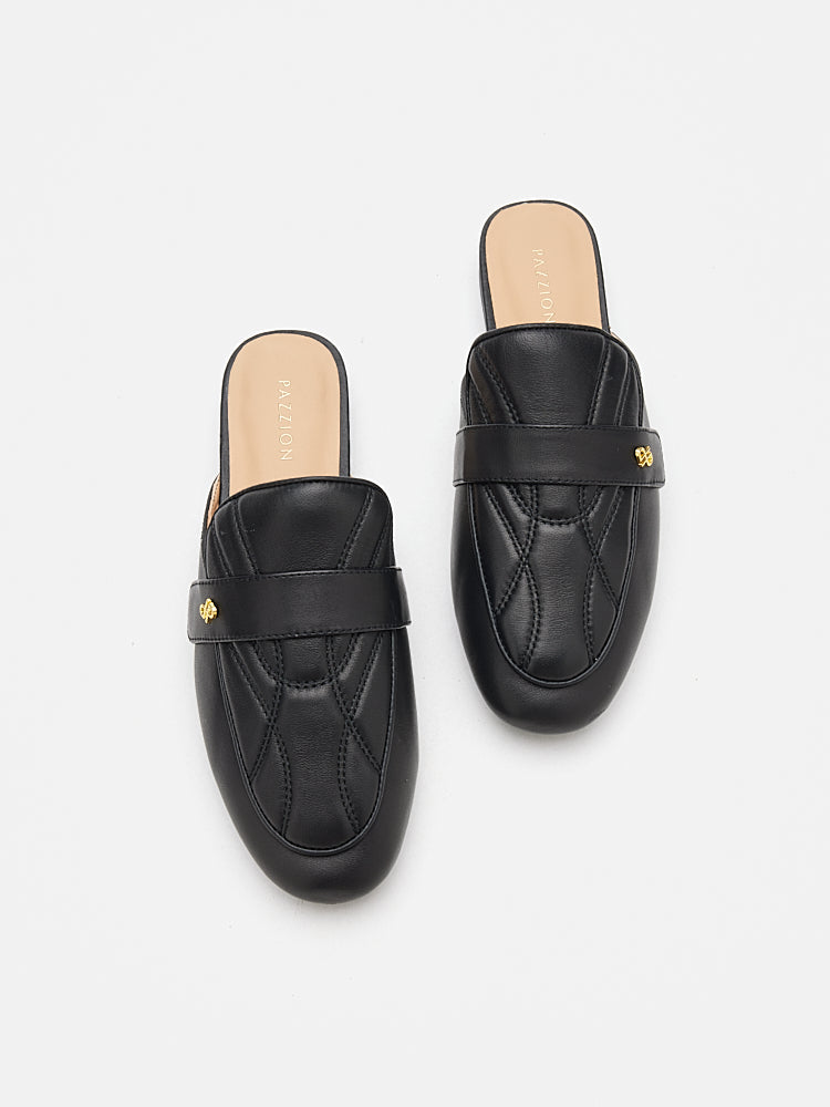 Sara is a standout addition to your shoe collection, seamlessly blending comfort with high fashion. These mules boast an exquisite quilted upper and a chic, minimalist logo detail on the side. The almond toe silhouette offers a sleek, streamlined look, while the slip-on design ensures effortless wear. Crafted from soft, supple leather, the padded insoles promise luxurious comfort with every step. Perfectly versatile, the Sara mules elevate any ensemble, from casual denim to sophisticated dresses, making them an essential for the modern fashionista. The Pazzion logo completes the design with an iconic note.