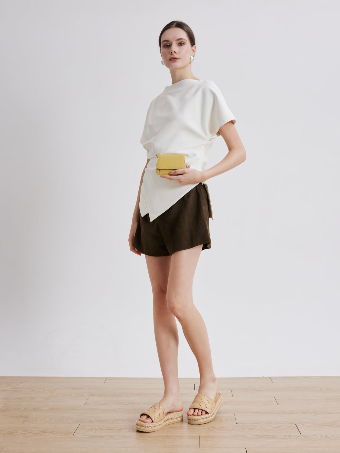 Channeling understated sophistication, Clare showcases a woven upper punctuated by a gleaming PAZZION logo accent that completes the design with an iconic note. Nestled on a supportive rubber outsole, plush lambskin insole, and leather looped chain details with a woven raffia lower sole, these wedges lend an air of effortless grace and classic modernity.