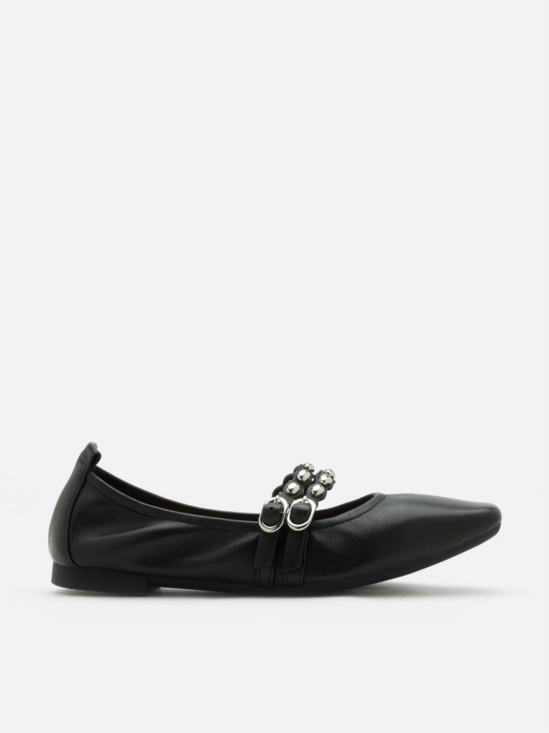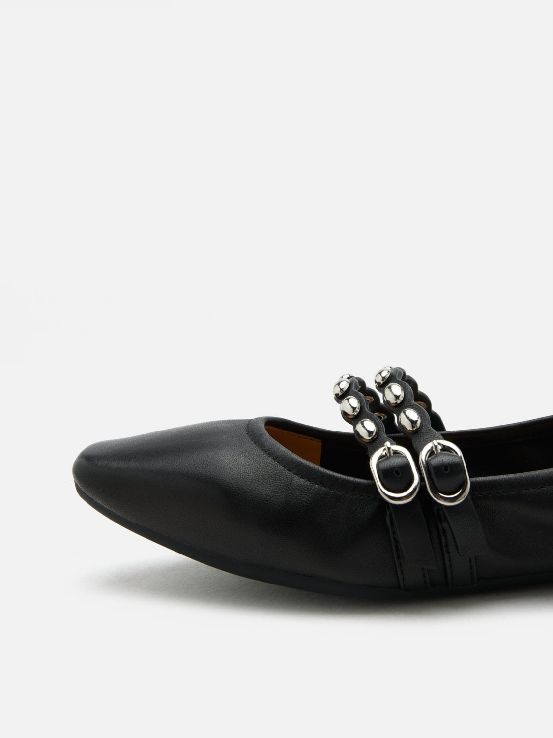 Crafted from supple lambskin, Sydney features a distinctive square toe and a unique design focal point: oval-studs meticulously placed across the double straps, offering a bold yet refined statement. With a softly squared toe and a cushioned lambskin insole, these flats effortlessly blend comfort and edgy sophistication in timeless black or soft yellow.