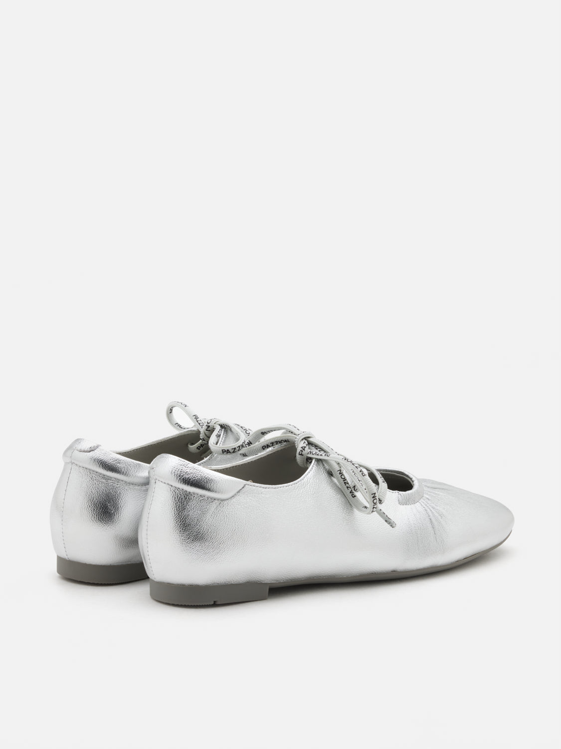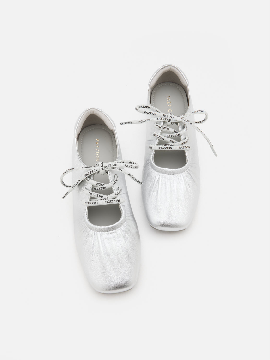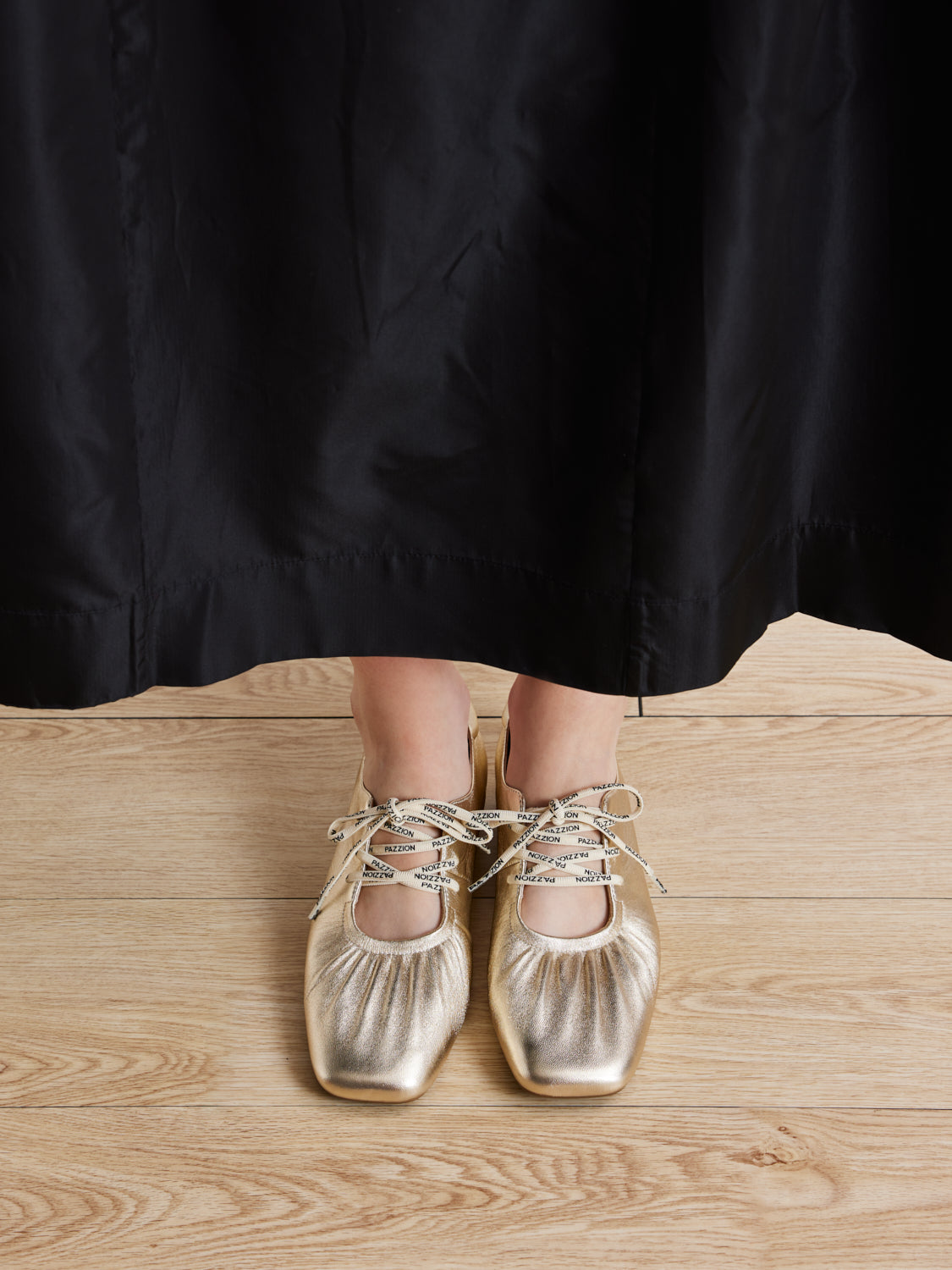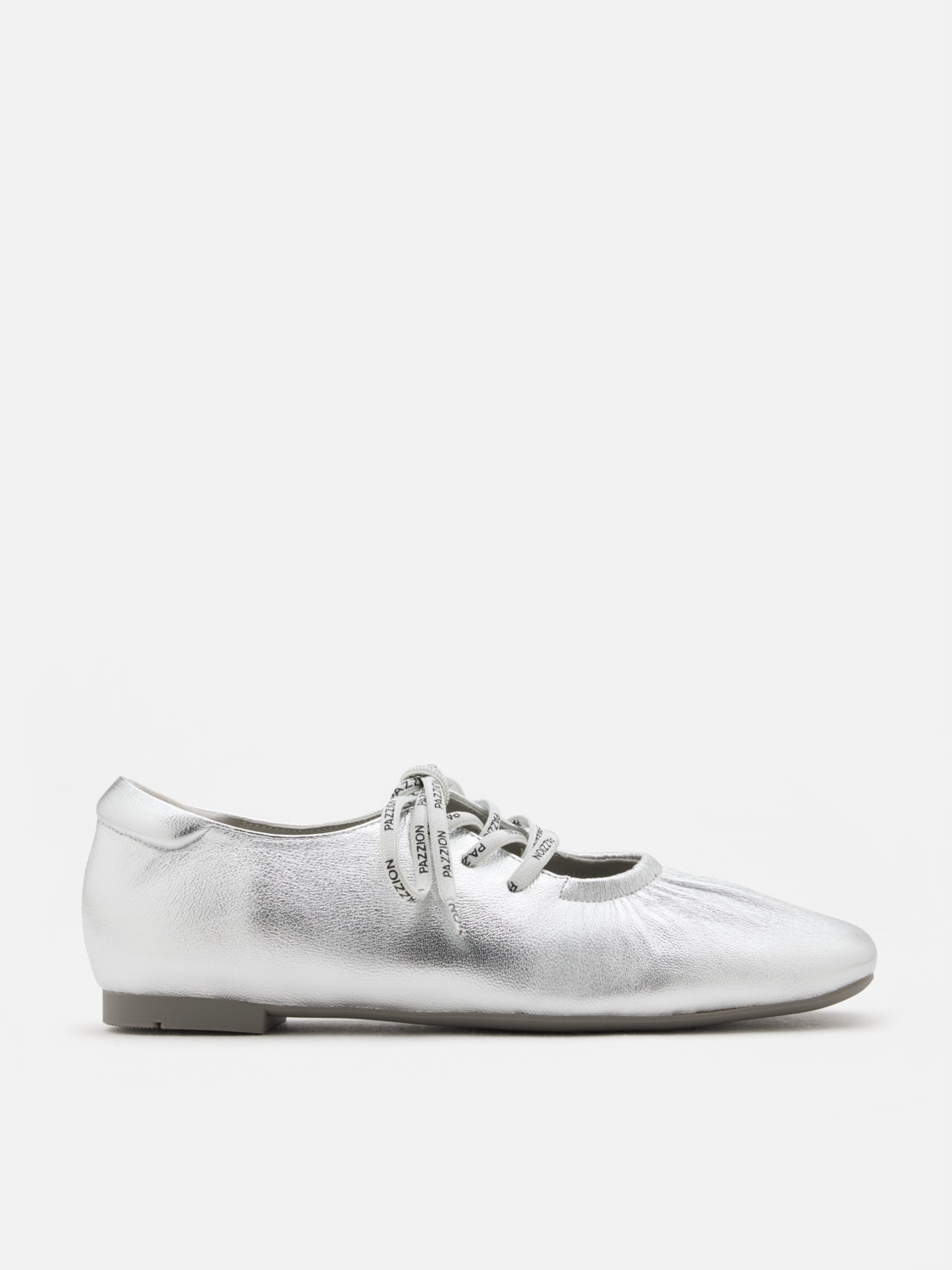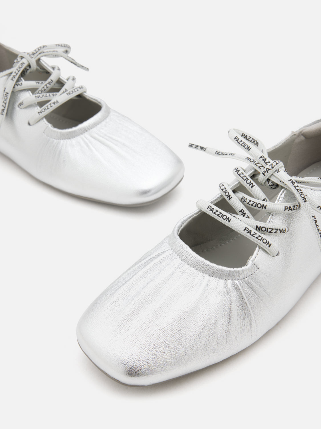 Imbued with the quiet luxury of supple lambskin, the Pernille flats elevate classic ballet inspiration with a contemporary metallic sheen in gold and silver. Featuring signature PAZZION logo-embossed laces and a gathered design, these flats are enhanced by a plush pillow cushion at the heel for lasting comfort. A perfect harmony of refined details and everyday wearability.