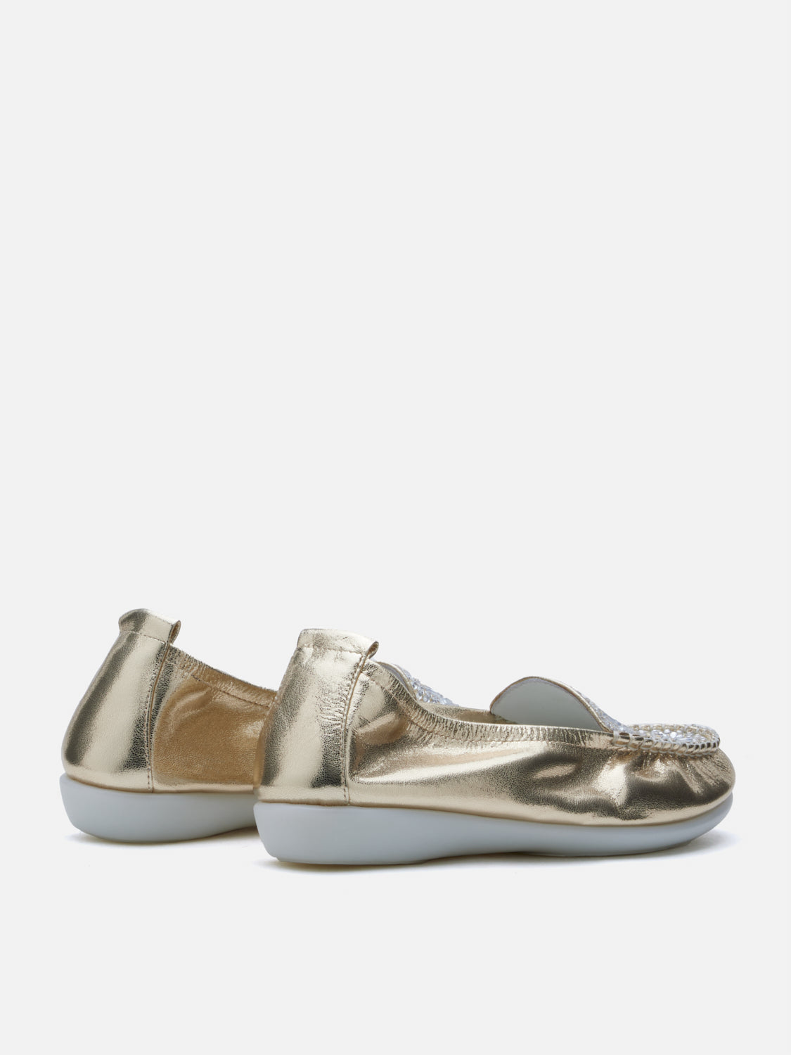 PRODUCT DESCRIPTION With a shimmering gold or silver cowhide leather upper, these loafers elevate understated sophistication through a graceful display of crystal embellishments forming an intricate floral motif. Lined with plush lambskin and finished with a durable rubber outsole, they blend quiet luxury with striking visual appeal. DETAILS Material: Cowhide...