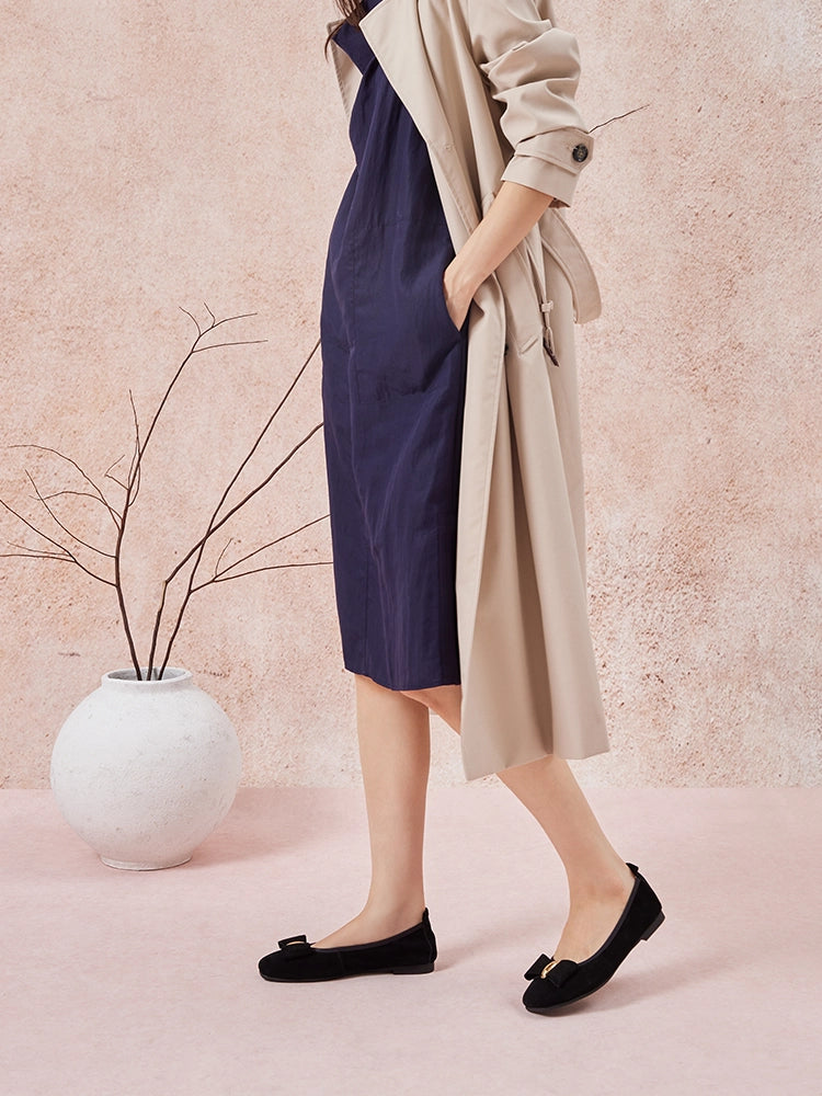 Quiet luxury and refined minimalism converge with Keyla. Crafted from plush cowhide suede, the tonal bow is punctuated by gleaming metallic hardware for an everlasting allure. A thick padded insole paired with sumptuous lambskin lining cradles the foot in uncompromising comfort, while the flexible rubber outsole ensures effortless grace. Offered in classic black, sunlit yellow, and warm brown, Keyla adds perennial chic to every wardrobe.