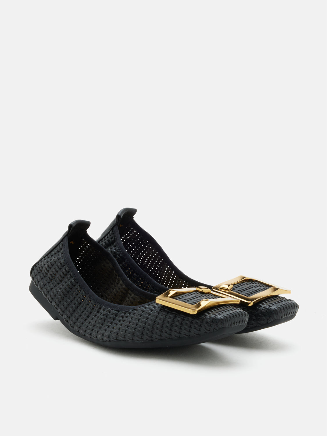 PRODUCT DESCRIPTION Wren offers a masterful blend of perennial chic and textural intrigue with its woven texture and striking metallic square-shaped decorative buckle. Crafted from microfiber with a lambskin lining and a flexible rubber outsole, these flats provide an effortlessly graceful fit. A versatile choice for those who appreciate quiet...