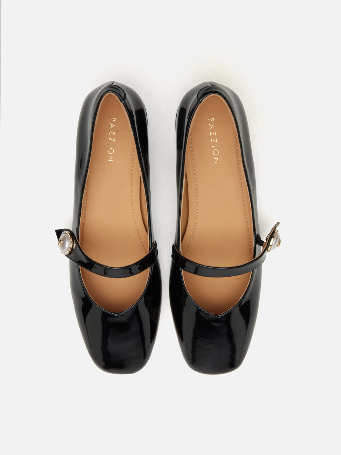 These low heels feature shiny cowhide patent leather with a crystal-detailed pearl on the Mary Jane strap. The 3.5cm block heel gives a comfortable lift, while the thick padded insole and padded back ensure all-day comfort.