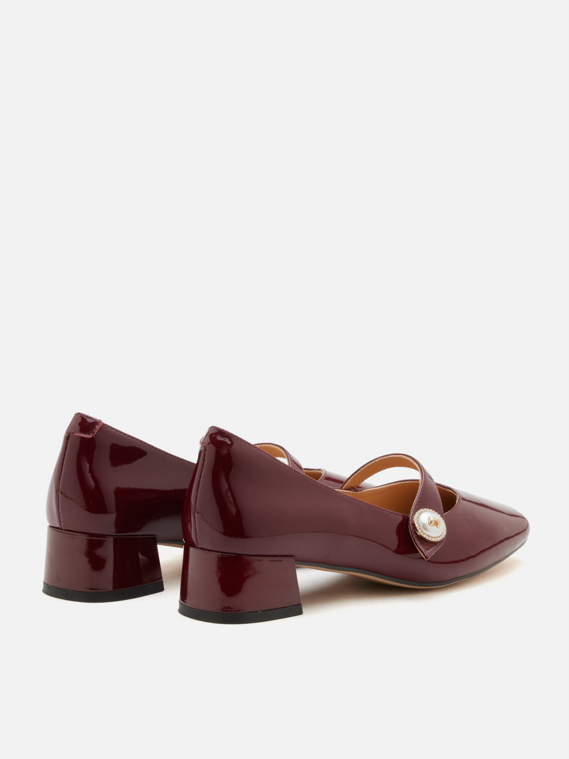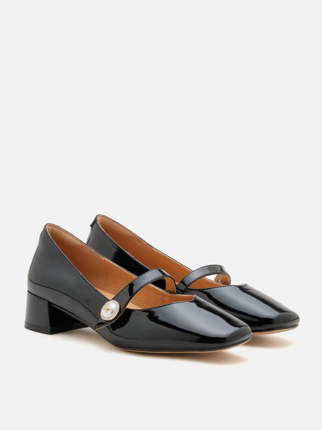 PRODUCT DESCRIPTION These low heels feature shiny cowhide patent leather with a crystal-detailed pearl on the Mary Jane strap. The 3.5cm block heel gives a comfortable lift, while the thick padded insole and padded back ensure all-day comfort. DETAILS Material: Cowhide Patent Leather Lining: Lambskin Insole: Lambskin Heel Height: 3.5cm...
