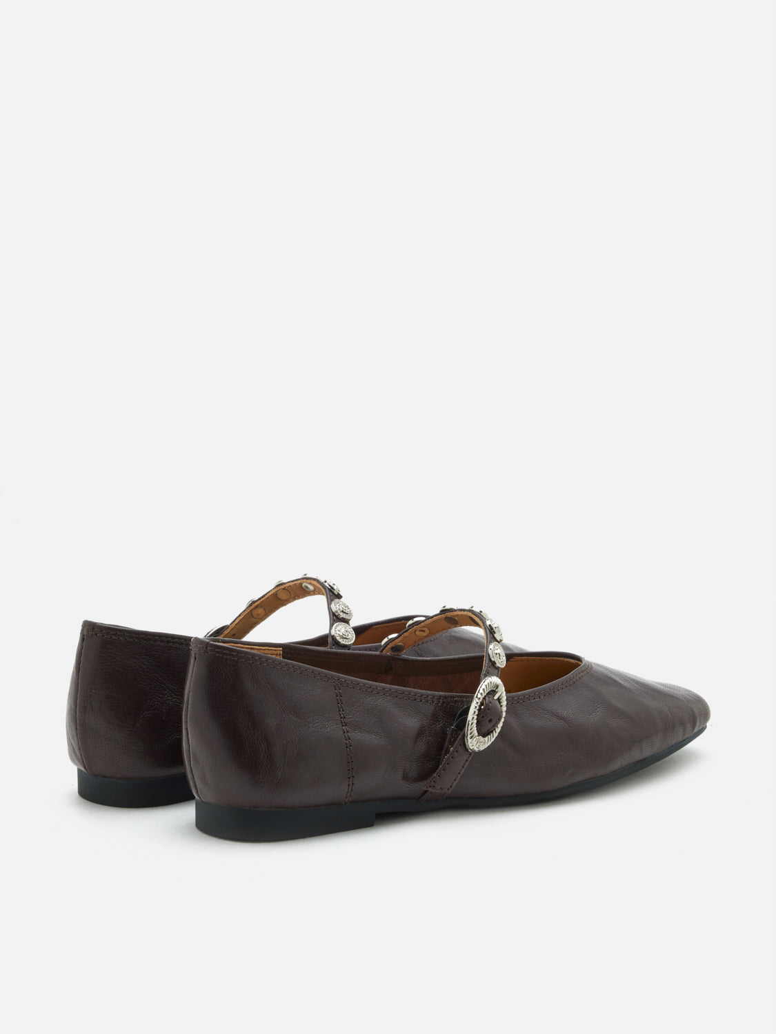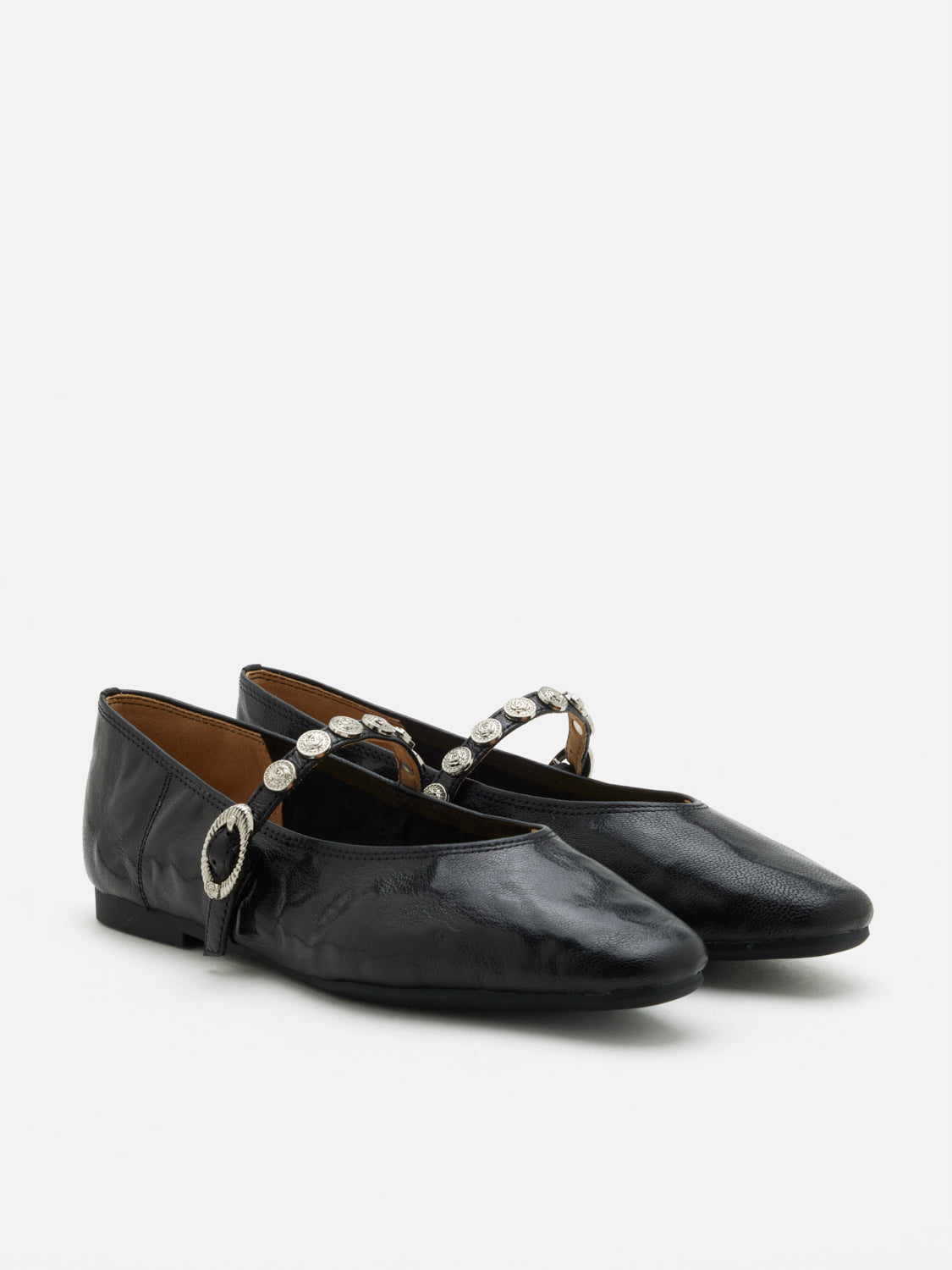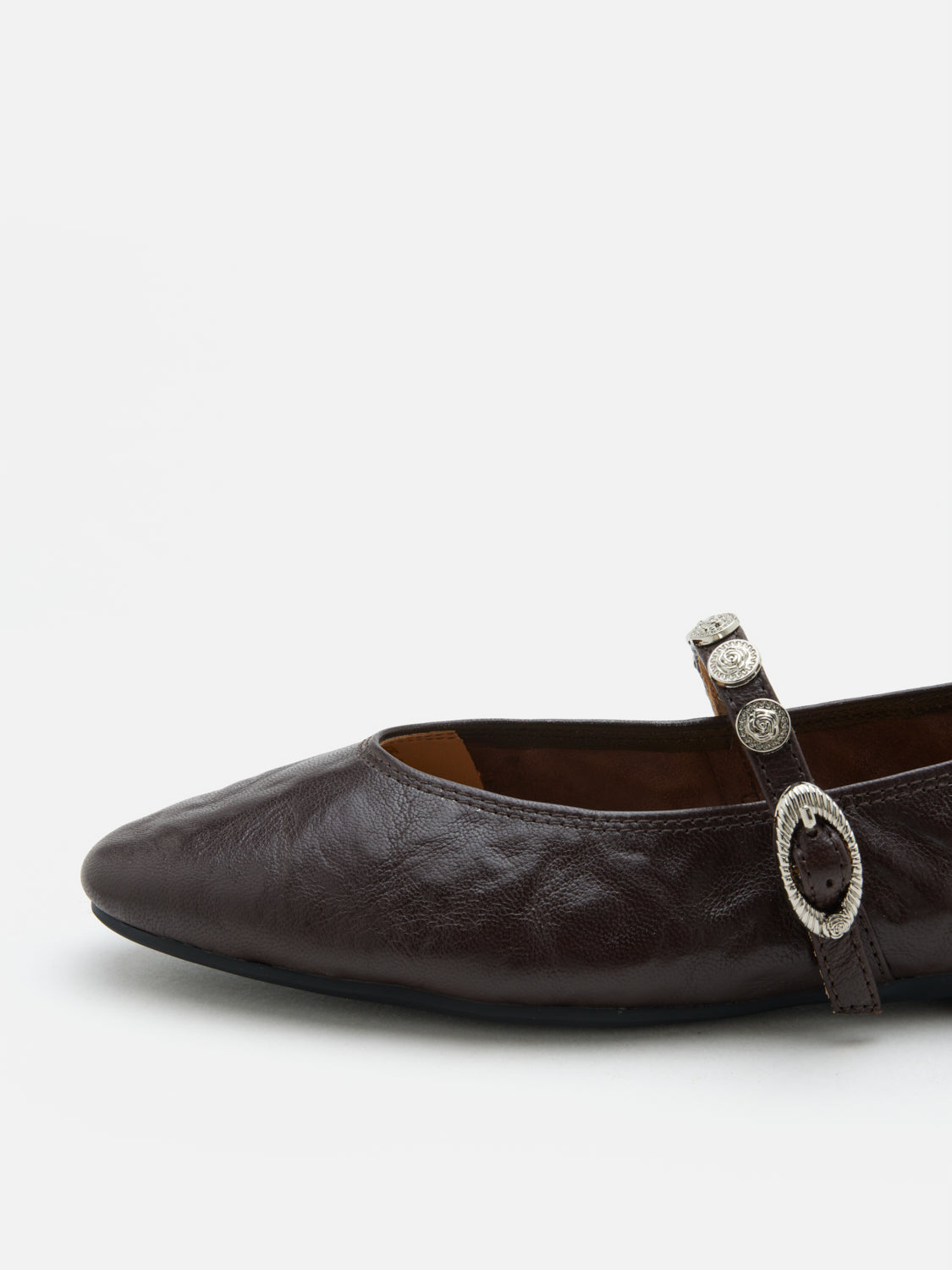 Refined yet bold, the Lumi Mary Janes feature soft lambskin leather accented with flat circular studs on the strap, each designed like a vintage coin with a delicate rose motif at the center. The textured belt buckle adds a touch of artisanal detail, while the thick padded insole with arch support ensures exceptional comfort, perfect for the fashion-conscious woman who values both style and function.