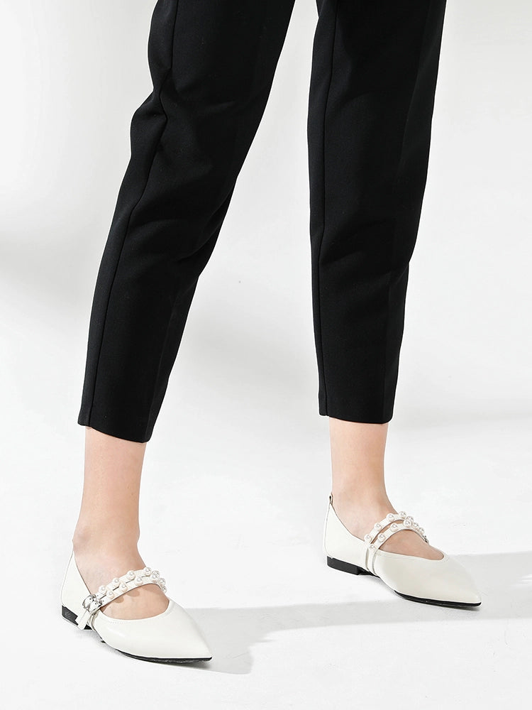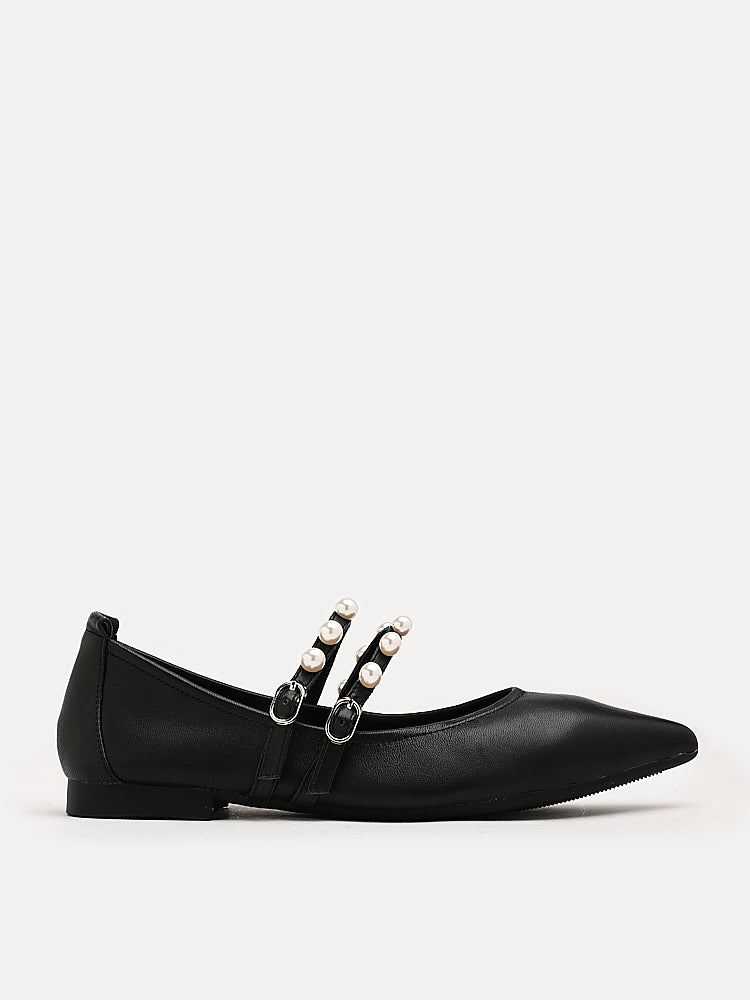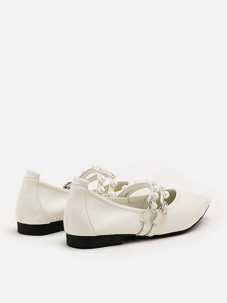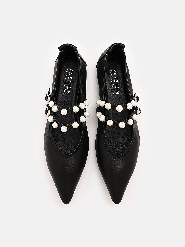 PRODUCT DESCRIPTION The Mabel flats are beautifully decorated with lustrous faux pearls along the slim, partially elasticated strap, which enhances the glamorous, elevated feel. Designed in a point-toe silhouette with lambskin leather, and rest on a slight heel that's comfortable for the daily commute or any night of celebrations....